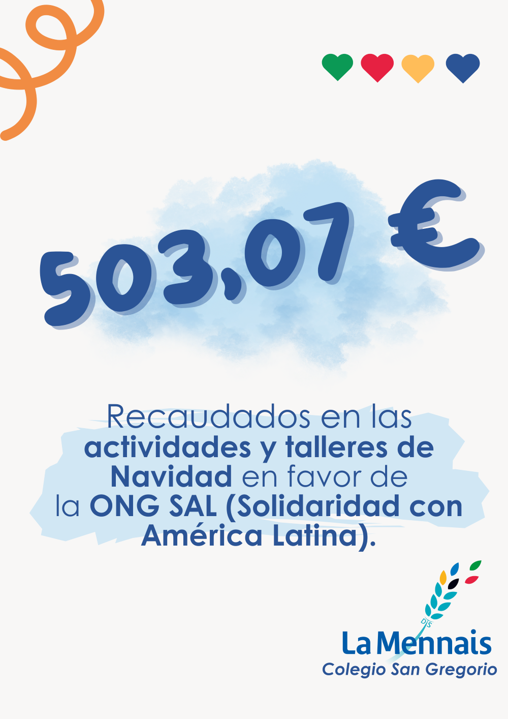 Queremos daros las gracias y haceros saber que la cantidad recaudada en las actividades y talleres de Navidad 2025 ha sido de 503,07 € que se donarán de forma íntegra a la ONG SAL (Solidaridad con América Latina), una iniciativa que nos permitirá seguir ayudando en la construcción de escuelas infantiles en el Barrio de San Damián (Argentina).